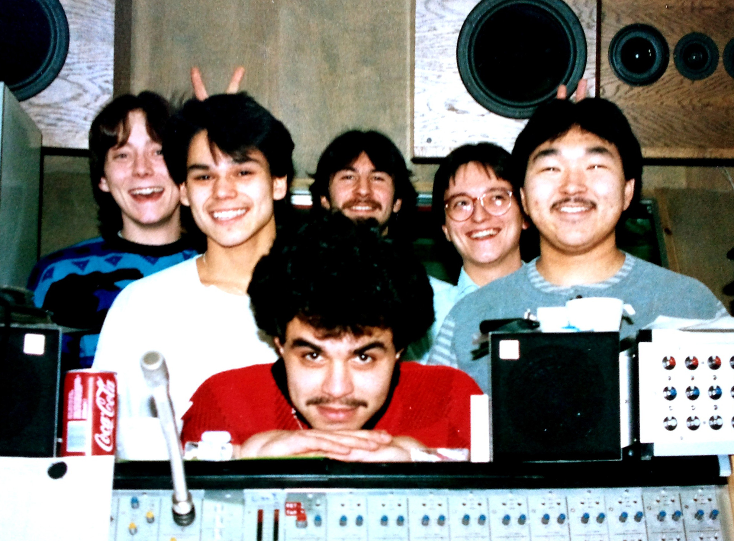G-60 og teknikker Kim Larsen i Qilaat-music’s studie i Nuuk januar 1987. Fra venstre: Hans Rosenberg, Aqqa Johansen, Kim Larsen (i forgrunden), Eigil Petersen (i baggrunden), Tuka Lynge og Jacob Johansen